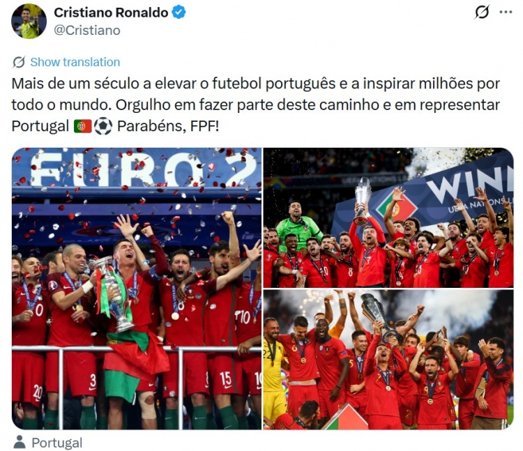 葡萄牙传奇球星C罗今日社媒发文,晒出球队的三座大赛冠军(欧洲杯1个+欧国联2个),这位41岁的老将写道:“一个多世纪以来,不断提高葡萄牙足球,并激励全球数百万球迷。能投身这条征程,身披葡萄牙战袍为国出征,我倍感自豪 🇵🇹⚽ 恭喜葡萄牙足协!”